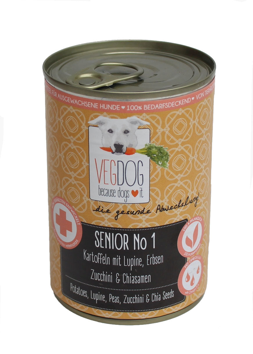 VEGDOG Senior NO 1 is een compleet natvoer voor de oudere hond op basis van soja, aardappelen, gierst, wortel, algen en chiazaad. Het is graanvrij en perfect afgestemd op de behoeften van honden vanaf 7 jaar die een verlaagde hoeveelheid energie nodig hebben en een hoger gehalte aan voedingsstoffen. Ook honden die kampen met overgewicht kunnen gebaat zijn bij dit voer.